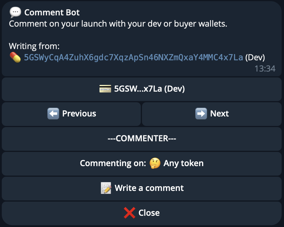 The commenter function gives you more social proof for your token. It makes it appear that the buyers are real buyers for your own token (or any other token for that matter). To use this, head over to /start and click on "Commenter". This will open a new menu.\